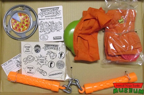In addition to standard issue knee and elbow pads with sash belt in the appropriate color, you also got the corresponding weapon of Leo, Don, Raph or Mikey. Nunchakus were rad, but I always thought the coolest feature was the turtle nose attached to the bandana mask. Playmates really added an extra element of imagination with that bit of molded rubber. What I don't recall are the flying pizza dish and National Turtle Quiz Jokebook that were also packed in, but I assume most of my friends lost those immediately after opening the box.Thanks to Vintage Ninja Turtle Museum for the pics.