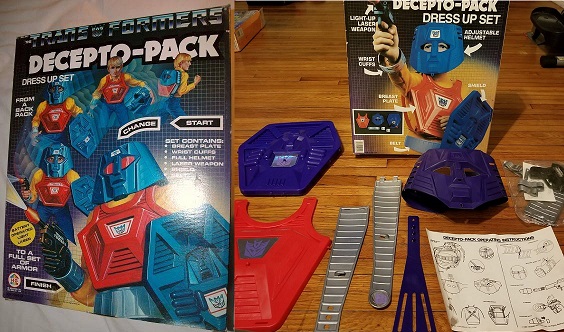 A mainstay of Hasbro's commercials in the 80s were kids literally being transformed into robots with blocky video effects, so the seeds were already being planted for these dress-up kits and this one had a cool concept. You could wear the whole costume as a backpack, then take it apart and wear the pieces to become a robot in disguise. The only confusing thing on the box art is that red and blue color scheme obviously belongs to the heroic Autobot, Optimus Prime, but it looks like the actual pieces inside had the more appropriate purple colorations of the Decepticons, so I guess it's a wash.