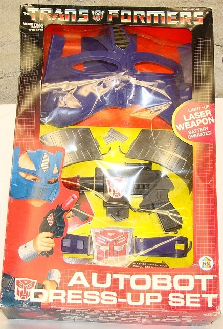I have to say that the official Autobot Dress Up Kit is a little more lackluster in execution. Truth be told I would still wear that Autobot insignia belt buckle to this day and that's a fairly decent rendition of Optimus Prime's face for the mask, but the wrist cuffs don't quite play for me. It was pretty clever that they got the kid on the box to wear a read shirt to complete the look, though that is unfortunately not included. Speaking of robo heroes...