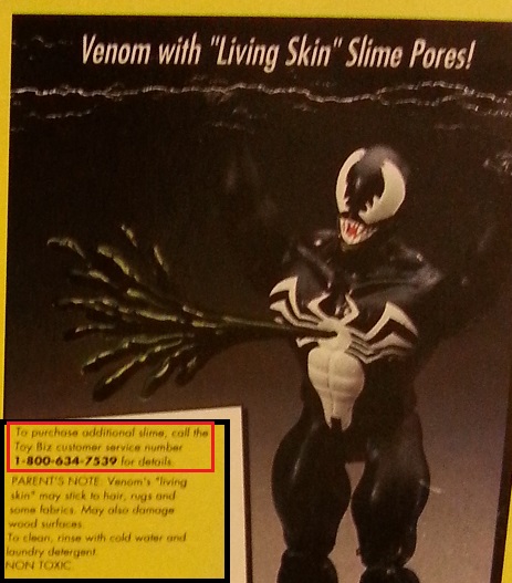 The action feature here was "Living Skin Slime Pores", which basically meant a hole in his chest that you could squeeze black slime through with the use of a plunger on the figure's back.The "Venom Slime" was kind of watery and did not burst out in tendrils as shown in the example on the back of the box, where the slime is comically drawn on. Really, it just slowly "splooshed" out like grape Jell-O (yum!). One amusing bit from the back of the box is the fact that you could call the toy company directly to order more slime. It cracks me up to imagine the Mom that had to make that call, "Uh, yes, do you have the...what's it called again, Derek?" "Venom slime, GOSH!" "The, uh, Venom slime?"