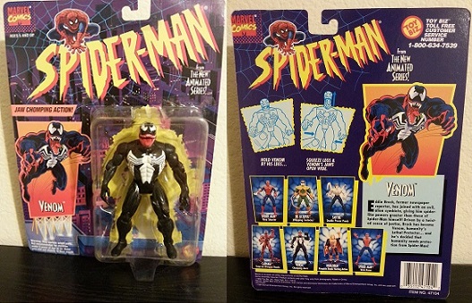 When Spider-Man: The Animated Series hit FOX saturday mornings in 1994, Venom was front and center as one of the featured foes in the opening credits, so he got a figure in the first wave released to promote the show. Retaining the leaner body sculpt, Toy Biz switched out the flicking tongue for "Jaw Chomping Action", which was really a step down in my opinion. By squeezing the legs the top half of his head would pop-up as the future "Lethal Protector" did his best impression of a PEZ dispenser. Besides, the weird mouth design made Venom look more like Audry II from Little Shop of Horrors than the vengeful hybrid of man and sentient space goo.