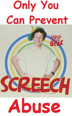 Not only does Jessie’s tantrum get the focus from the group, while Screech is left to suffer in solitude, but in the College Years he ends up at the same dum-dum California school as Zack and Slater! Talk about lost potential. Is it any wonder that by the end of the series he seems to be in his own little world, with the group mostly ignoring him or groaning away his nonsensical interjections? He went from being acknowledged only when verbally assaulted to simple neglect. Remember, only YOU can prevent Screech abuse.