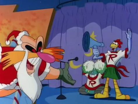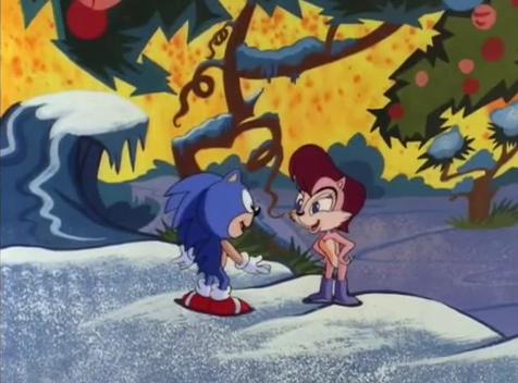 Sally makes a brief appearance, and her only appearance, in this part of the special. She doesn't have any dialogue either, which is weird but to move things along Sonic explains that he has a plan to get her a present from Robotropolis after she'd given him a ring. Tails tags along and has a different voice actor this time around, obviously because this special aired three years after AoStH. As for Scratch and Grounder, their only purpose is to go door to door to rid houses from citizens who don't give in to the demands of sending a gift to Robotnik.