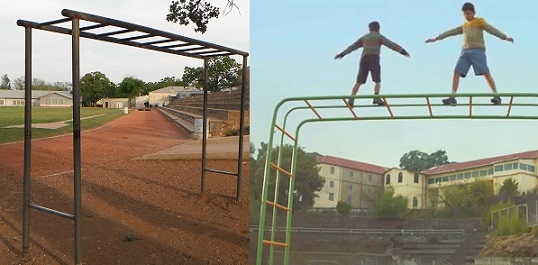 Let’s face it, the basic use of playground equipment gets boring after a while. That’s why kids very quickly opt for climbing up the slide, jumping off the swings or in this case, climbing across the top side of the monkey bars. I’ll never forget the day Tyler decided to show how rad he was by crawling across the metal grid in an action that was less monkey like and more akin to a sleepy Opossum who had gotten himself into a predicament.