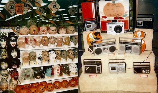 Oh, it looks like we've arrived in time for the Halloween season. Drug Stores were always the best place to find an affordable costume for Trick or Treating. Just look at this wonderful assortment of rubber monster masks. It looks like you have your choice of a Devil, Bozo the Clown or Gene Simmons from KISS, among others. Oddly enough, there's also a Halloween sale on Boom Boxes, so I suppose we better pick up an audio cassette by Oingo Boingo or Ozzy Osbourne so as to not be too conspicuous.