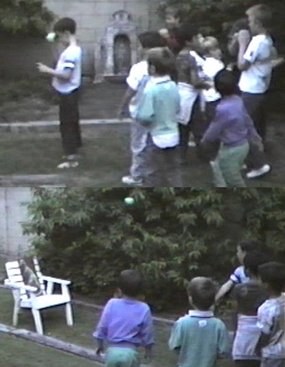 There's nothing harder to control than a group of nine, rowdy 7 year olds, so my Mom wisely herded me and my buddies into the backyard to wear us out before the festivities began. Yes, that's me waving at the camera in the Toronto Blue Jays jersey (click here to read about my embarrassing t-ball career) and the rest of the gang is making good use of my swing set. The crew was a mix of friends from school, church and even my pre-school in-home daycare days. Once we got tired of entertaining ourselves, my Mom assembled us all for a game.