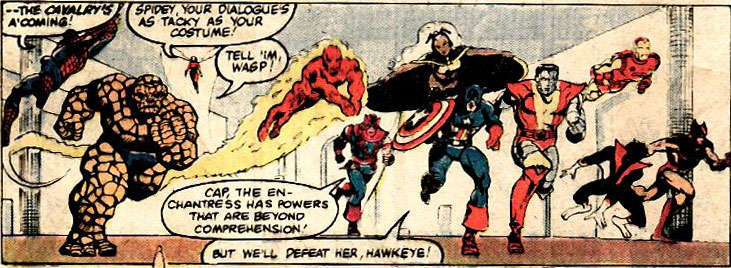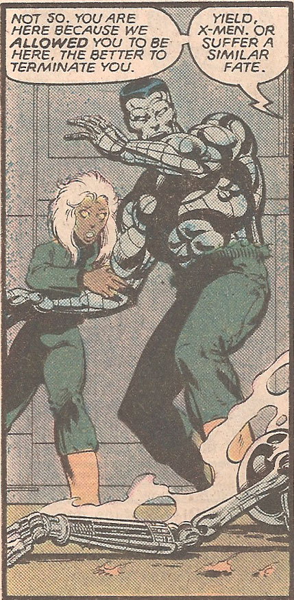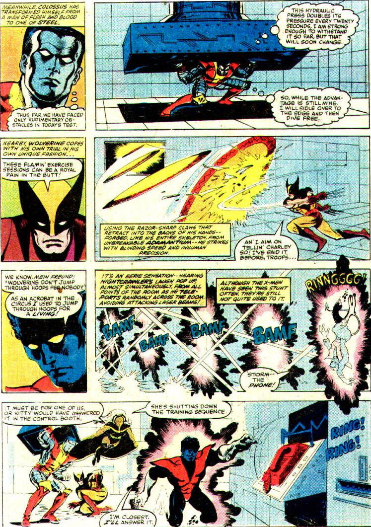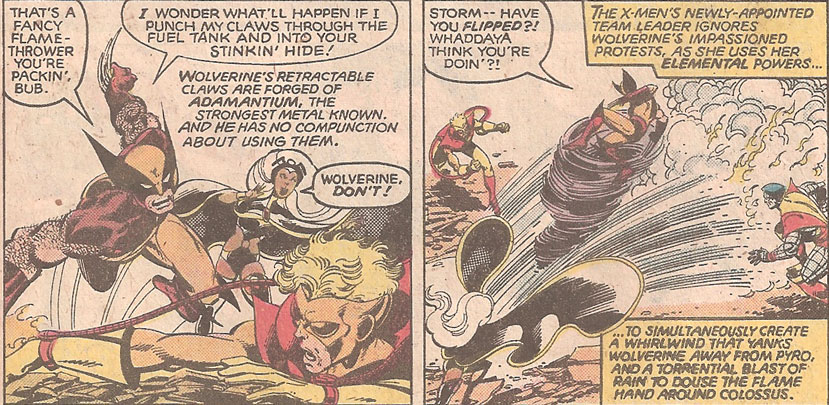 Again Wolverine is about to use his claws, and for the second time during the battle Storm stops him. She lists his abilities as speed, strength, and an unbreakable adamantium skeleton; add to that the fast-healing ability, and his animal keen senses. Speaking of which because of the catastrophic burn damage to his system from the fire he is unable to tell using his senses which Nightcrawler is real and which is the doppleganger until he heals more fully. Doppleganger means double goer in German. We have seen him use his super-human speed against the Hulk, his super-human strength to break chromalloy steel shackles, and the fact that his skeleton is unbreakable many times. As for his other abilities*