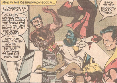 After Kitty walks through all the dangers set aside for her in the Danger Room during her first official training as an X-Man unfazed in her phased state we see Logan still has his irreverent sense of humor and still has some animosity towards Professor X.