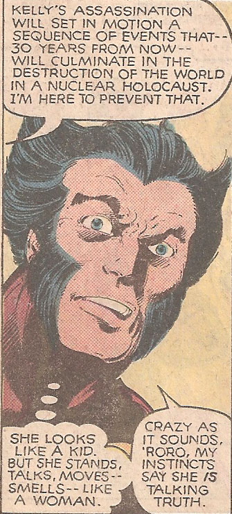 When future Kate tells the X-Men about the genocide of mutants and the impending nuclear armageddon as the fate of the world if they don't prevent the assassination, Logan knows she is telling the truth using his heightened senses.
