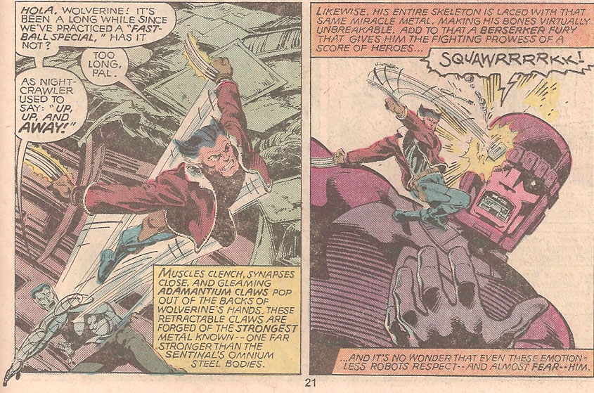 Meanwhile future Wolverine has broken the remaining X-Men out of the detention center and they are making their way towards the heart of Manhattan using old subway tunnels. Sentinels find them however and a battle begins. We see an old favorite still being used in the future, the fast-ball special. Wolverine's claws have no problem against the omnium steel sentinel. We also see a retcon but it concerns a future Wolverine and not our current one, however it does give insight to Chris Claremont's plans for the character. Back in Uncanny X-Men 126 we learned that Wolverine's skeleton was made of adamantium*. Now we are told that future Wolverine's skeleton is laced with adamantium not made from it, still making his bones virtually unbreakable.
