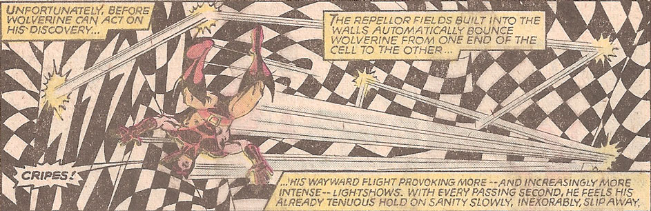 Without gravity Wolverine has a hard time orienting himself because of the patterns on the walls and the lights that are overwhelming his senses.