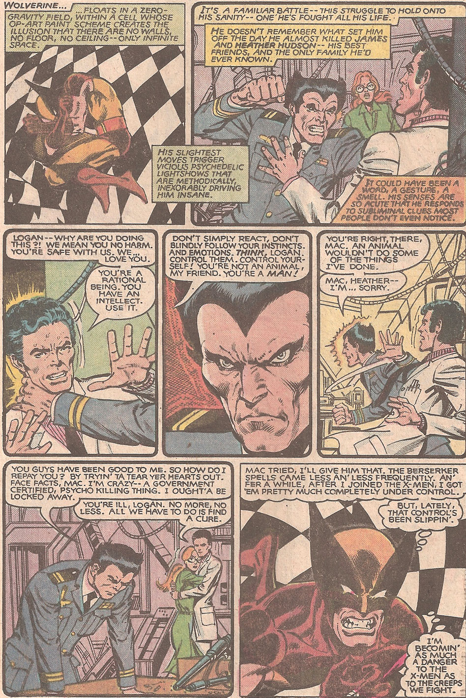 Wolverine flashes back to a time with Department H when he nearly killed his friends James and Heather Hudson who were family to him, the only he had ever known. Wolverine is seen in a Royal Canadian Air Force military uniform with a OF-2 Captain's rank.* He has full wing insignia on his right chest but unfortunately not in enough detail to see what specialty. It could be pilot, flight engineer, navigator, search and rescue technician, loadmaster, or sensor operator that all have full wings. All other specialties have half wings. It could also be paratrooper wings. He also has some indiscernible commendations.* We learn that Logan's senses are so acute that he responds to subliminal cues. He also regrets some of the things he has done. He was certified by the Canadian government as being psychotic or suffering from a psychosis as of yet undetermined to the reader and he is a killer. He received some mental treatment but was not cured. He is in a constant battle to control himself.