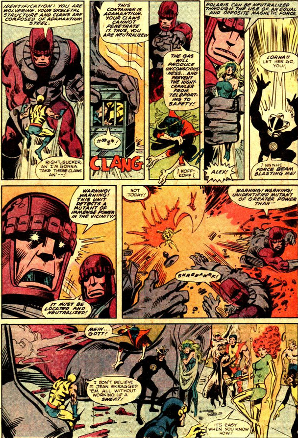 Since Wolverine's costume was just roasted off of him he has to fight au naturale. Using teamwork they trash the battle suits.