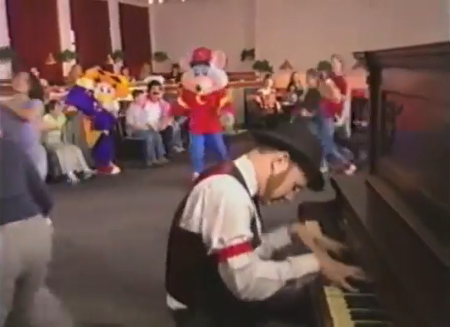 Fun fact: The pianist seen here performing is actually none other than Christopher Sabat, who if you know your anime voice acting well, voiced Vegeta, but also voices Mr. Munch, Chuck E.'s purple friend in this movie.