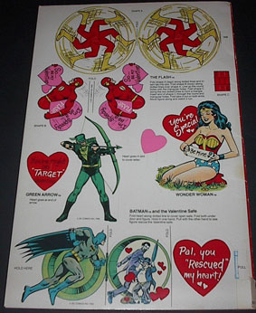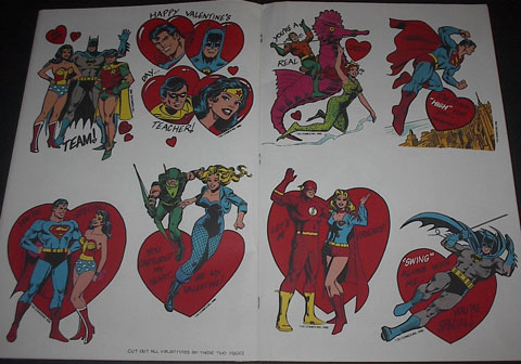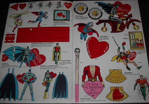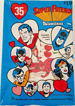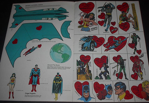 Some lucky kid got a Super Friends Action Valentine Playbook that had plenty of regular Valentine's cards for their classmate but in addition had 30 extra action Valentine's featuring your favorite DC comics heroes and villains that you assembled to decorate his desk with, give to his or her best buddy, etc., and a Batman or Wonder Woman mask to wear during the class party! Why was this never in my life?