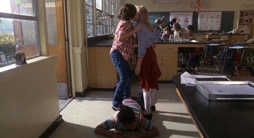 He firmly plants one on her just as E.T. saw on T.V., with the help of another student chasing frogs on the floor.