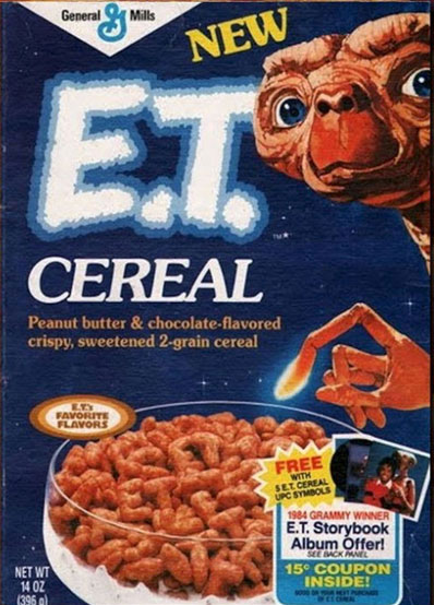 F.Y.I. even though the candy used in the film was Reese's Pieces, originally it was supposed to M&M's. My alien pal was eating M&M's in the novelized version of the movie and in the original screenplay, but when approached M&M Mars didn't want their product associated with aliens thinking it would be frightening to children (to be fair the movie scared my future wife so badly she peed her pants in the theater at the age of 3). Hershey's didn't have a problem and signed a huge deal to cosponsor merchandise and have their Reese's Pieces in the film, it was incredibly successful for them. I would have preferred M&M's to be the alien's candy of choice because I am allergic to peanuts. The peanut theme even led to the E.T. cereal being peanut butter flavored prohibiting me from ever enjoying any.