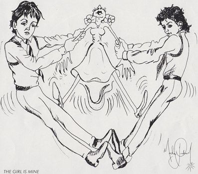 I remember sitting on the floor with my brother and listening to the Michael Jackson and Paul McCartney song The Girl is Mine from the Thriller album playing on the record player. While listening we read the lyrics on the inside of the album cover and it had several drawings. This one pretty much summed up our struggle.