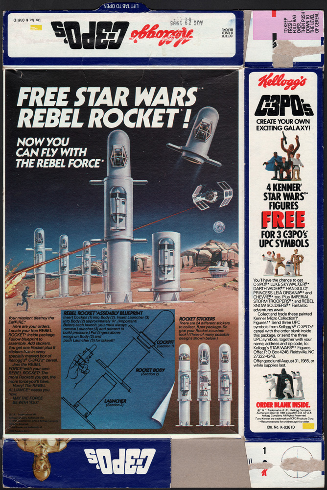 1985 Kelloggs C-3POs cereal box - Free Rebel Rocket and Kenner Micro Figures