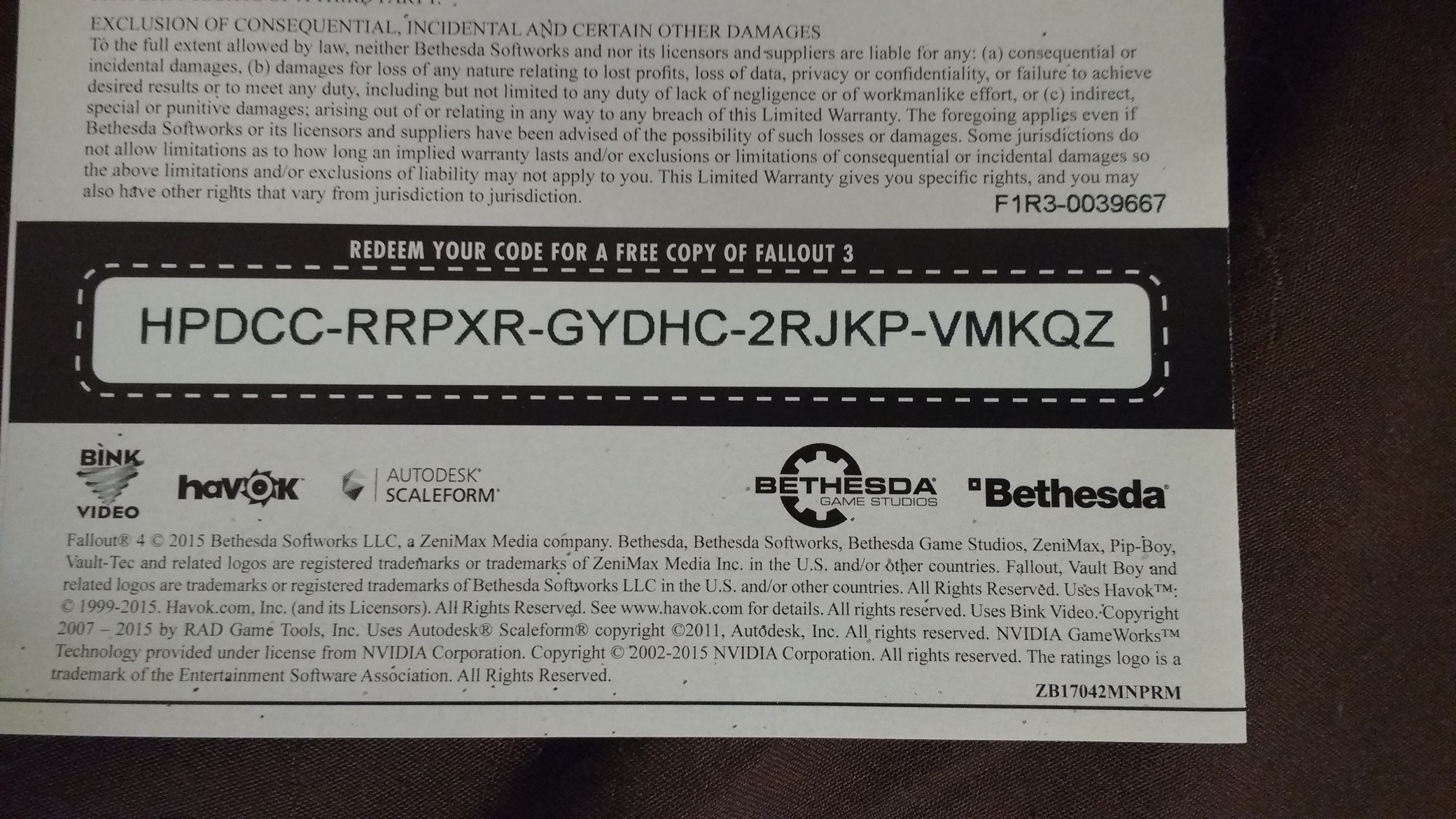 So, I have a digital code for a copy of Fallout 3 (not the newest game, but the one before) on Xbox 360/Xbox One that I haven't used. I already own a digital copy of it so I don't need this code. I figured someone here might want it: